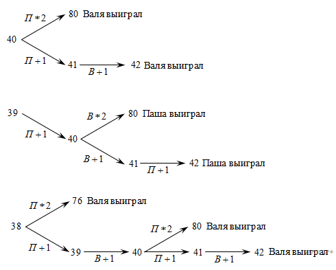 б) При S = 40 и S = 38 выигрышная стратегия есть у Вали и при S = 39 — у Паши. Построим деревья игры.