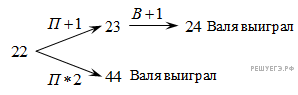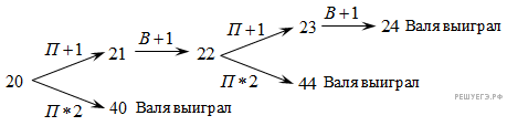 Паша и Валя играют в следующую игру: перед игроками лежит куча камней, каждый игрок за один ход может добавить в кучу 1 камень или удвоить количество камней в куче. Камни для ходов не ограничены. Выигрывает тот игрок, после хода которого в кучу оказалось 24 и более камней, но не более 38. Если после хода игрока в куче более 38 камней, выигрывает его соперник. Первым ходит Паша.