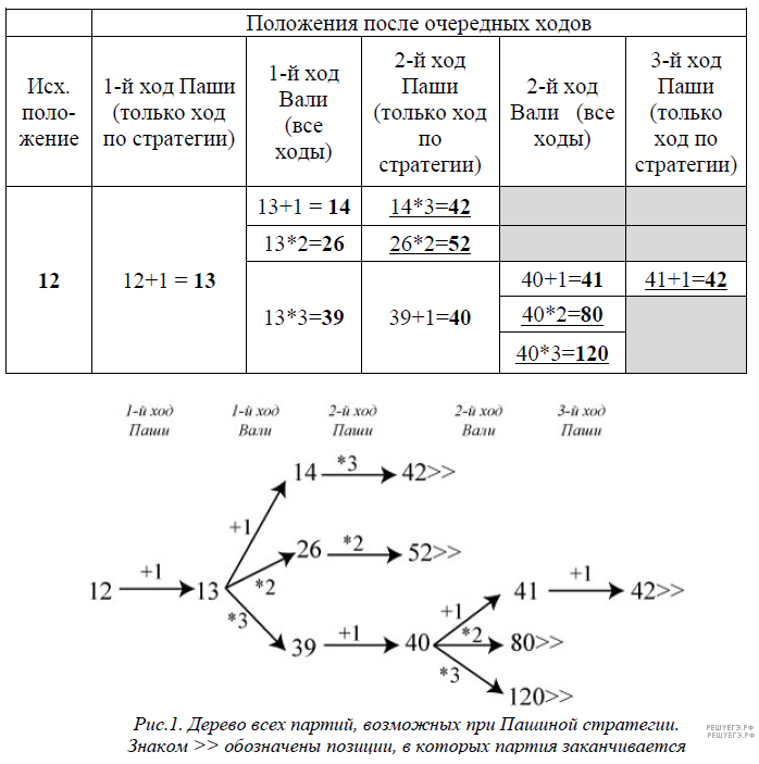 2. При S = 13 после первого хода Паши в куче будет либо 14 камней, либо 26 камней, либо 39 камней. Во всех этих случаях (см. п.1) выигрышная стратегия есть у игрока, который должен ходить, теперь это Валя. Таким образом, при S = 13 выигрышная стратегия есть у Вали. 3. При S = 12 выигрышная стратегия есть у Паши. Своим первым ходом Паша может добавить в кучу один камень и получить кучу, в которой 13 камней. В этой позиции выигрышная стратегия есть у игрока, который не должен ходить (см. п. 2), то есть у Паши. В таблице изображено дерево возможных партий при описанной стратегии Паши. Заключительные позиции (в них выигрывает Паша) подчёркнуты. На рисунке это же дерево изображено в графическом виде (оба способа изображения дерева допустимы).