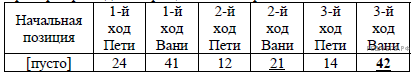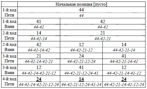 Таблица 1. Дерево всех партий при выигрышной стратегии Пети, позволяющей ему выиграть своим четвертым ходом. Над пунктирной чертой указаны ходы игроков. Завершающие игру ходы подчеркнуты. Под пунктирной чертой в скобках приведены цепочки фишек после очередного хода.