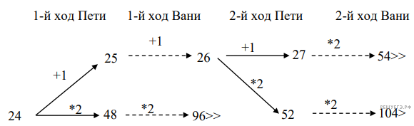 Возможные значения S: 13, 25. В этих случаях Петя не может выиграть первым ходом. Однако он может получить кучу из 26 камней (при S = 13 он увеличивает количество камней в два раза, при S = 25 добавляет 1 камень). Эта позиция разобрана в п. 1б. В ней игрок, который будет ходить (в данном случае это Ваня), выиграть не может, а его противник (то есть Петя) следующим ходом выиграет.