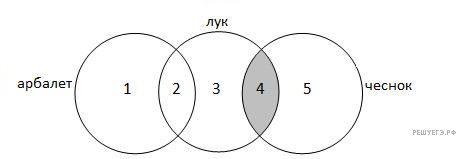 Представим таблицу в виде кругов Эйлера. Пусть арбалет — круг 1, лук — круг 3, чеснок — круг 5. Тогда задача — найти количество элементов N в областях 2, 3, 4: N2 + N3 + N4. По таблице известно: