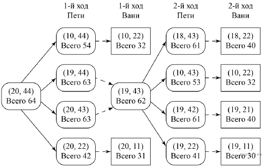В таблице изображены возможные партии при описанной стратегии Вани. Заключительные позиции (в них выигрывает Ваня) выделены жирным шрифтом. На рисунке эти же партии показаны в виде графа (оба способа изображения допустимы)