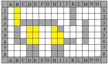 Исполнитель МАШИНКА «живет» в ограниченном прямоугольном лабиринте на клетчатой плоскости, изображенном на рисунке. Серые клетки — возведенные стены, светлые — свободные клетки, по которым МАШИНКА может свободно передвигаться. По краю поля лабиринта также стоит возведенная стенка с нанесенными номерами и буквами для идентификации клеток в лабиринте.