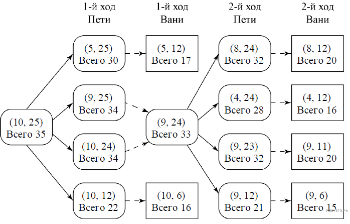 В таблице изображены возможные партии при описанной стратегии Вани. Заключительные позиции (в них выигрывает Ваня) выделены жирным шрифтом. На рисунке эти же партии показаны в виде графа (оба способа изображения допустимы).