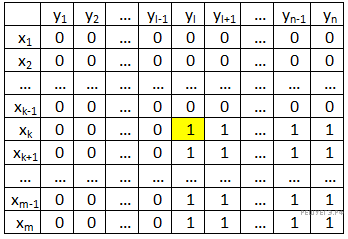 Внутри каждой строки и каждого столбца, кроме, возможно, последних, значения расположены по принципу не убывания, поэтому все клетки строки k правее выбранной ячейки, а также все клетки столбца l ниже выбранной ячейки, тоже должны быть равны 1. Поэтому xi=1 при k≤i≤m и yj=1 при l≤j≤n, откуда следует, что весь правый нижний прямоугольник состоит из единиц.