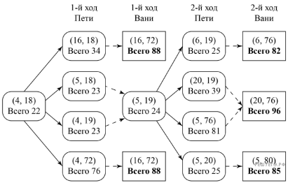 В таблице изображены возможные партии при описанной стратегии Вани. Заключительные позиции (в них выигрывает Ваня) выделены жирным шрифтом. На рисунке эти же партии показаны в виде графа (оба способа изображения допустимы).