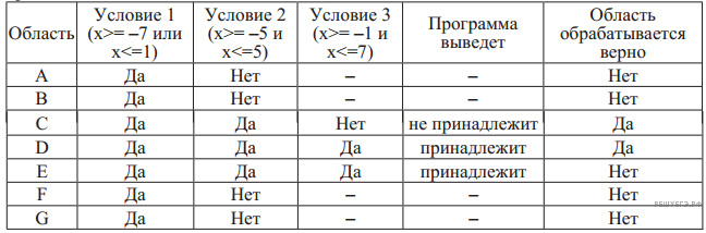 В столбцах условий укажите «да», если условие выполнится, «нет», если условие не выполнится, «—» (прочерк), если условие не будет проверяться, «не изв.», если программа ведёт себя по-разному для разных значений, принадлежащих данной области.