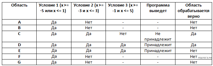 1. Перерисуйте и заполните таблицу, которая показывает, как работает программа при аргументе, принадлежащем различным областям (А, В, С, D, Е, F, G). Точки, лежащие на границах областей, отдельно не рассматривать. В столбцах условий укажите «да», если условие выполнится, «нет», если условие не выполнится, «—» (прочерк), если условие не будет проверяться, «не изв.», если программа ведёт себя по-разному для разных значений, принадлежащих данной области.