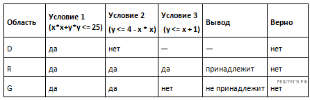 | Область | Условие 1 (х*х+у*у <= 25) | Условие 2 (y <= 4 - x * x) | Условие 3 (y <= x + 1) | Вывод | Верно |