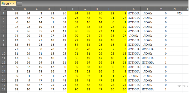 Откройте файл электронной таблицы, содержащей в каждой строке пять натуральных чисел.