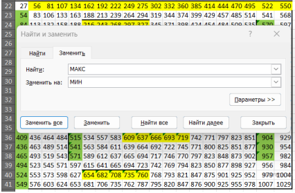 Теперь с помощью меню замены (Ctrl + H) заменим все вхождения МАКС в формулы на МИН.