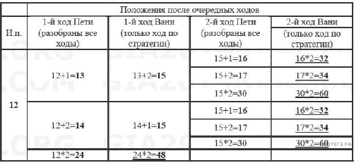 В таблице изображено дерево возможных партий при описанной стратегии Вани. Заключительные позиции (в них выигрывает Ваня) подчёркнуты. На рисунке это же дерево изображено в графическом виде (оба способа изображения дерева допустимы).