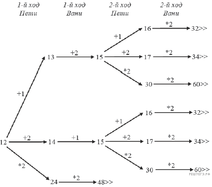 Два игрока, Петя и Ваня, играют в следующую игру. Перед игроками лежит куча камней. Игроки ходят по очереди, первый ход делает Петя. За один ход игрок может добавить в кучу один или два камня или увеличить количество камней в куче в два раза. Например, имея кучу из 15 камней, за один ход можно получить кучу из 16, 17 или 30 камней. У каждого игрока, чтобы делать ходы, есть неограниченное количество камней.