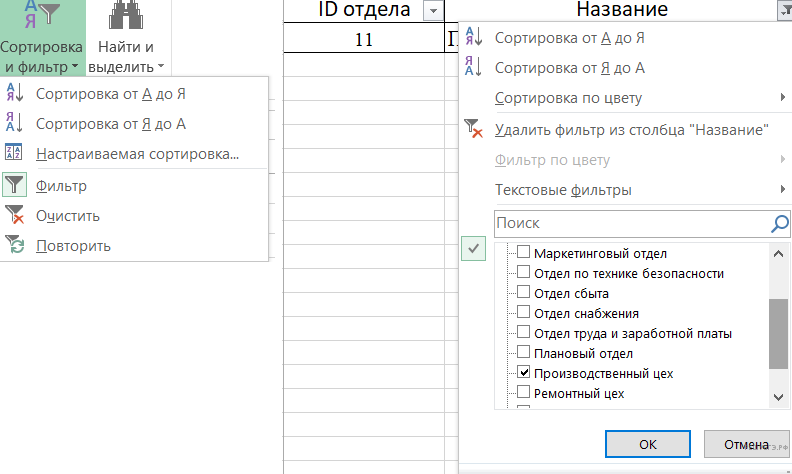 Открыв файл, перейдём на лист «Отдел». Воспользуемся стандартными средствами редактора Microsoft Excel: требуется отфильтровать записи в таблице, оставив только записи для отдела «Производственный цех». Для этого включим фильтр: