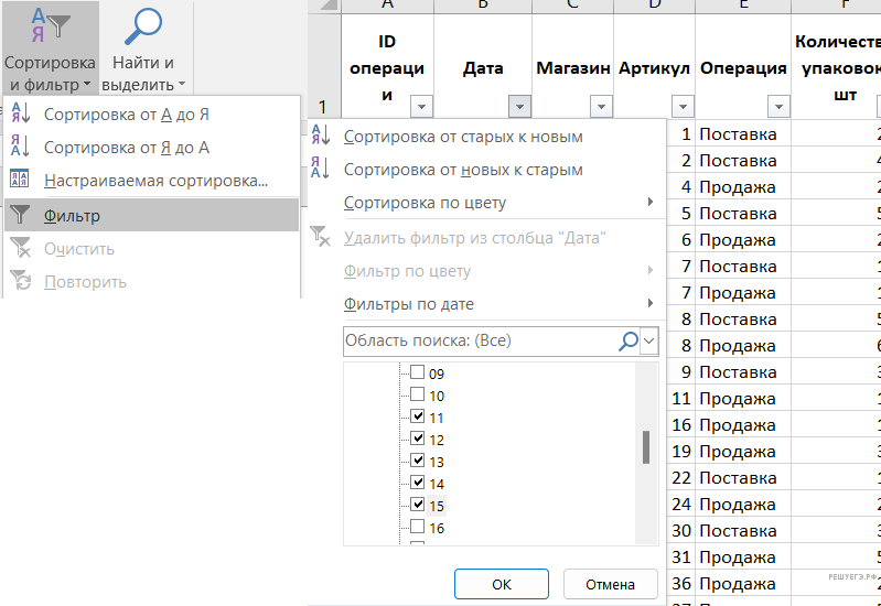 Воспользуемся стандартными средствами редактора Microsoft Excel, требуется отфильтровать записи в таблице, оставив только записи для района «Центральный», с 11 по 15 июня включительно, тип операции «Поставка», поставщик «Молокозавод №1». Для этого включим фильтр для столбцов