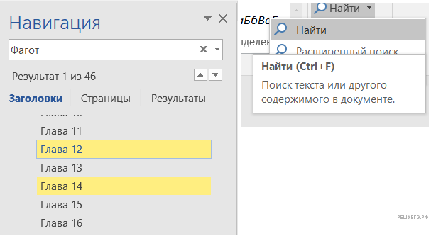 В строке введём «Фагот». Первое вхождение слова будет найдено на