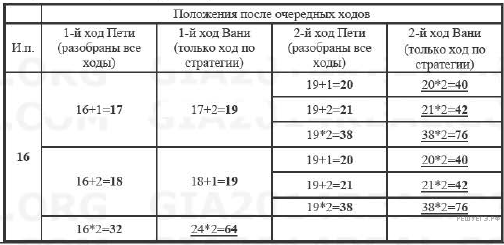 В таблице изображено дерево возможных партий при описанной стратегии Вани. Заключительные позиции (в них выигрывает Ваня) подчёркнуты. На рисунке это же дерево изображено в графическом виде (оба способа изображения дерева допустимы).