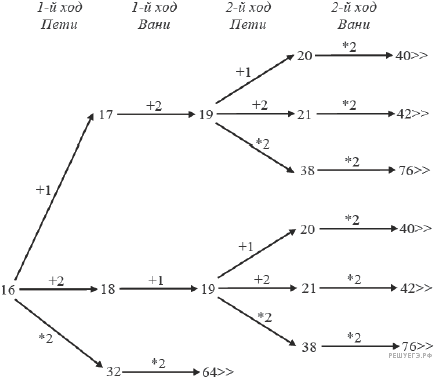 Два игрока, Петя и Ваня, играют в следующую игру. Перед игроками лежит куча камней. Игроки ходят по очереди, первый ход делает Петя. За один ход игрок может добавить в кучу один или два камня или увеличить количество камней в куче в два раза. Например, имея кучу из 15 камней, за один ход можно получить кучу из 16, 17 или 30 камней. У каждого игрока, чтобы делать ходы, есть неограниченное количество камней.
