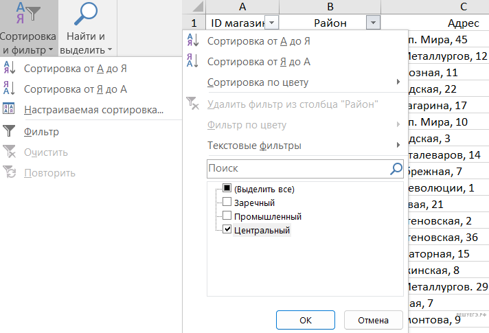 Открыв файл, перейдём на лист «Магазин». Воспользуемся стандартными средствами редактора Microsoft Excel: требуется отфильтровать записи в таблице, оставив только записи для магазинов Центрального района. Для этого включим фильтр: