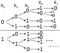 Пусть x1 = 0. При x2 = 1 возможен лишь один случай: x3 = 0, переменная x4 = 1. При x2 = 0 возможно два случая: x3 = 0 и x3 = 1. В первом случае x4 либо 1, либо 0, во втором — x4 = 0. Всего имеем 4 варианта.