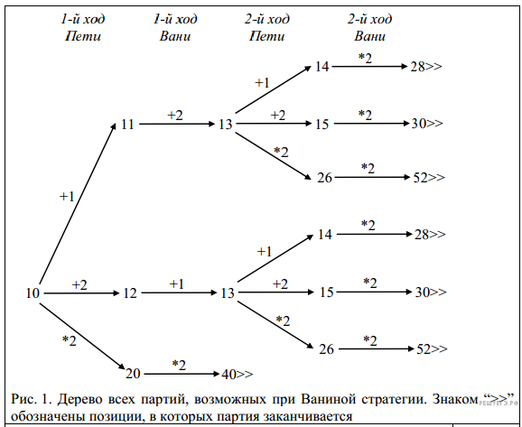 В таблице изображено дерево возможных партий при описанной стратегии Вани. Заключительные позиции(в них выигрывает Ваня) подчёркнуты. На рисунке это же дерево изображено в графическом виде(оба способа изображения дерева допустимы).