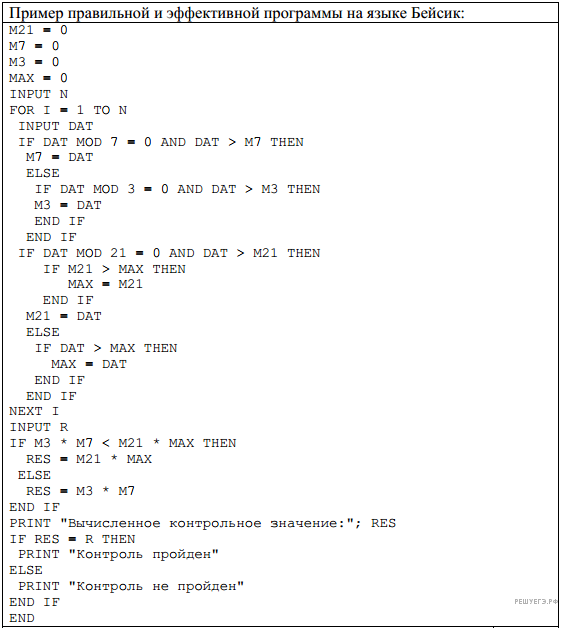 Кроме того, приведён пример программы на языке Бейсик, которая правильно решает задачу, но использует алгоритм, немного отличающийся от описанного выше. Возможны и другие правильные алгоритмы.