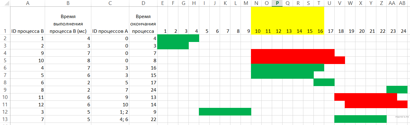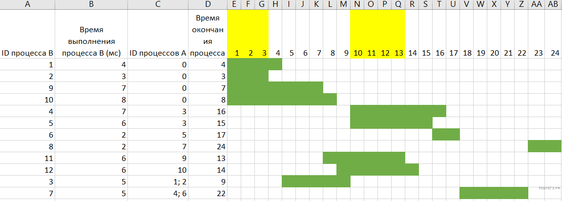 Информация о процессах представлена в файле в виде таблицы. В первом столбце таблицы указан идентификатор процесса (ID), во втором столбце таблицы — время его выполнения в миллисекундах, в третьем столбце перечислены
