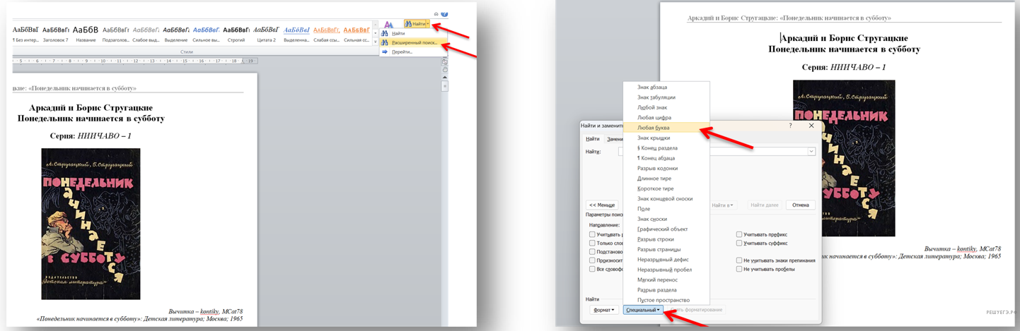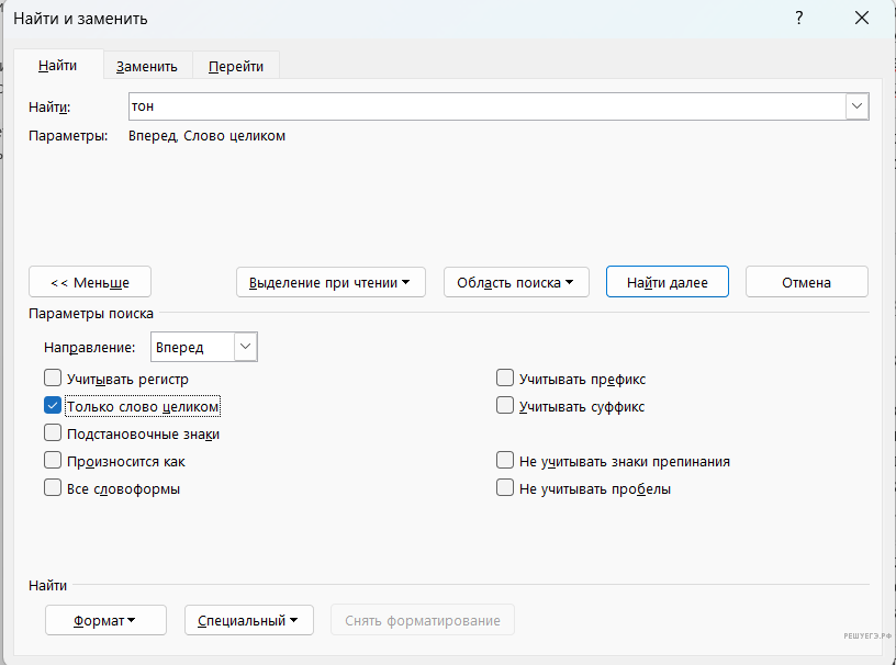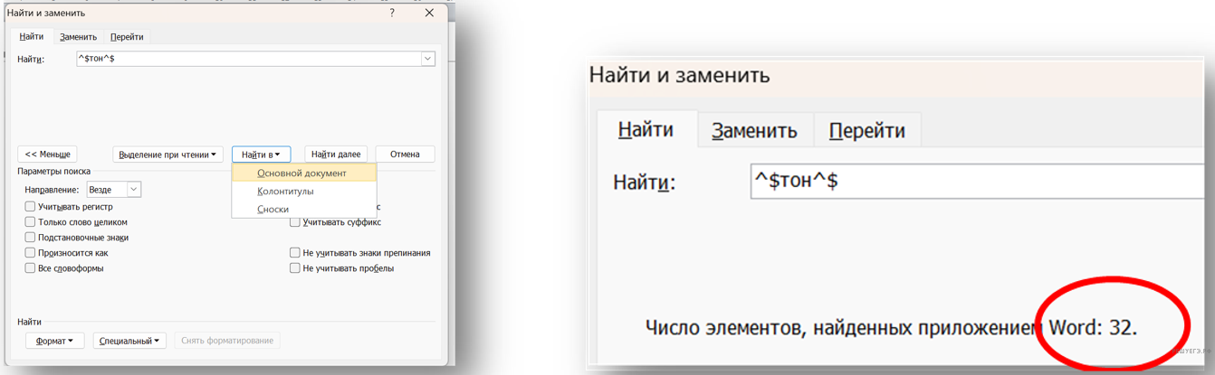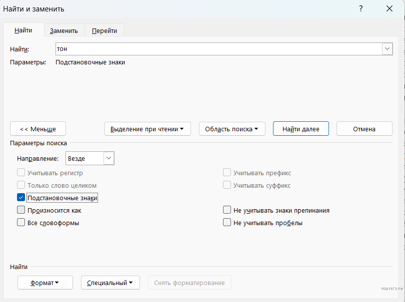 В расширенном поиске текстового редактора находим режим «Специальный» и добавляем «Любую букву» слева и справа от слова «тон»: