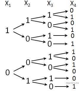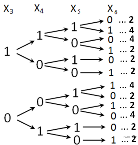 Третье уравнение связано со вторым только через переменные x5 и x6. Древо решений аналогичное. Тогда для системы из трёх уравнений каждая пара значений x5 и x6 будет порождать количество решений в соответствии с древом (см. рис.): пара (1, 0) породит 2 решения, пара (1, 1) породит 4 решения, и т. д.