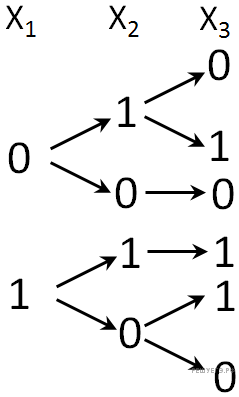 Поскольку уравнения идентичны с точностью до индексов переменных, древо решений второго уравнения аналогично первому. Следовательно, пара значений x2 = 1 и x3 = 1 порождает один набор переменных x2, ..., x4, удовлетворяющих второму уравнению. Поскольку среди наборов решений первого уравнения данных пар две, всего получаем 2 · 1 = 2 набора переменных x1, ..., x4, удовлетворяющих системе из двух уравнений. Рассуждая аналогично для пары значений x2 = 0 и x3 = 0, получаем 2 набора переменных x1, ..., x4. Пара x2 = 1 и x3 = 0 порождает четыре решения второго уравнения. Поскольку среди наборов решений первого уравнения данная пара одна, получаем 2 · 1 = 2 набора переменных x1, ..., x4, удовлетворяющих системе из двух уравнений. Аналогично для x2 = 0 и x3 = 1 — 2 набора решений. Всего система из двух уравнений имеет 2 + 2 + 2 + 2 = 8 решений.