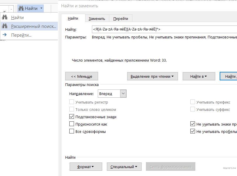 В расширенном поиске текстового редактора выбираем пункт «Подстановочные знаки»: