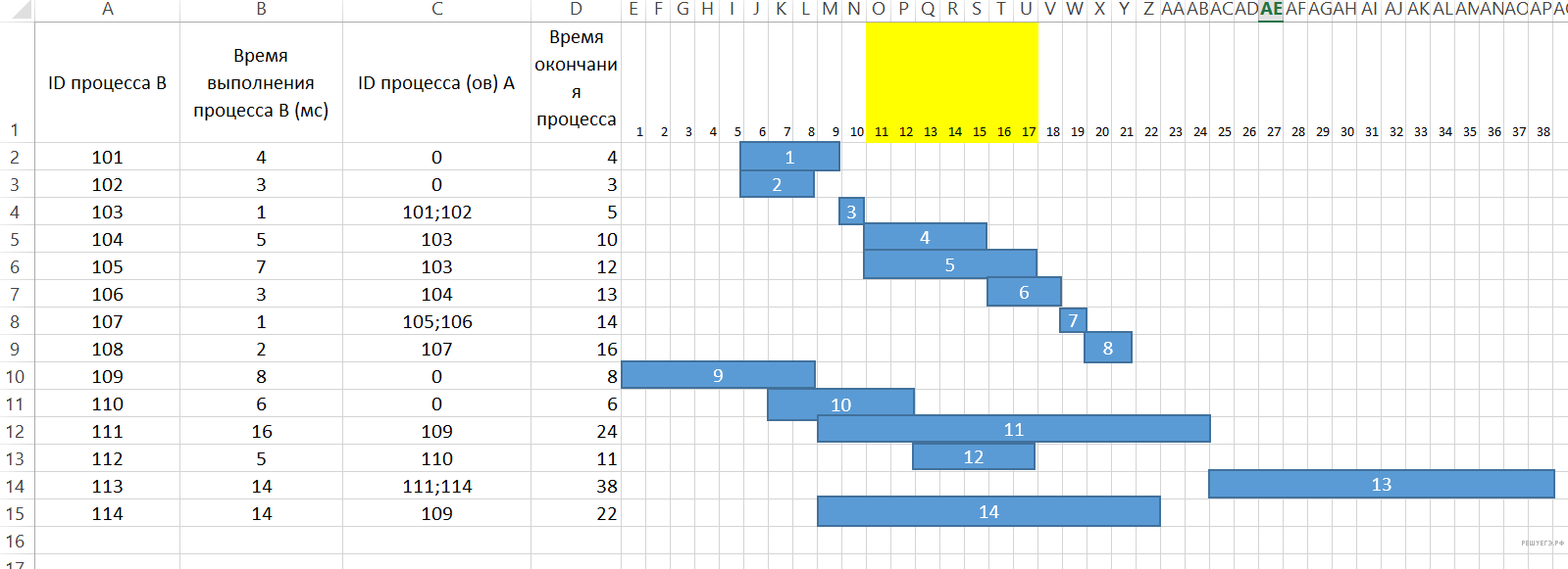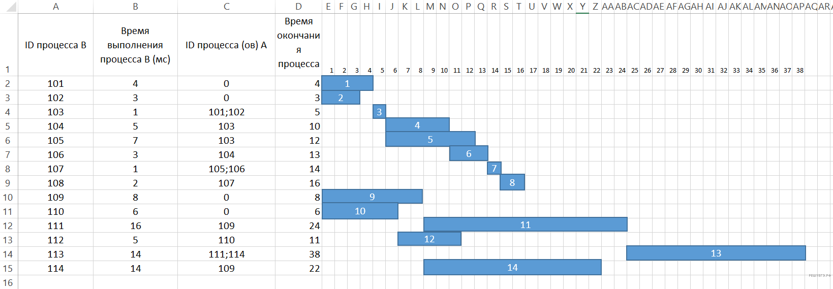 | ID процесса B | Время выполнения процесса B (мс) | ID процесса(ов) A |