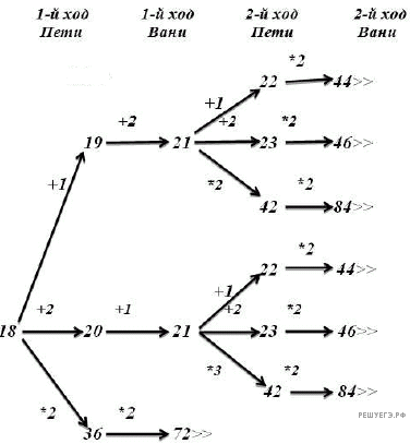 Два игрока, Петя и Ваня, играют в следующую игру. Перед игроками лежит куча камней. Игроки ходят по очереди, первый ход делает Петя. За один ход игрок может добавить в кучу один или два камня или увеличить количество камней в куче в два раза. Например, имея кучу из 15 камней, за один ход можно получить кучу из 16, 17 или 30 камней. У каждого игрока, чтобы делать ходы, есть неограниченное количество камней.