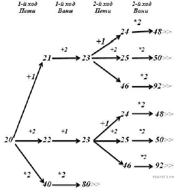 1. а) Петя может выиграть, если S = 24, …, 46, удвоив количество камней. При меньших значениях S за один ход нельзя получить кучу, в которой больше 46 камней.