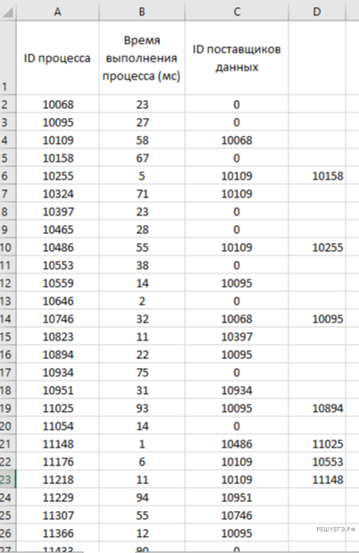 Информация о процессах представлена в файле в виде таблицы. В первой строке таблицы указан идентификатор процесса (ID), во второй строке таблицы — время его выполнения в миллисекундах, в третьей строке перечислены
