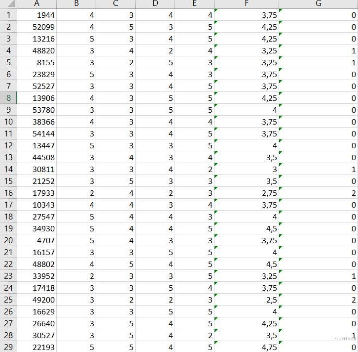 В столбце F будем считать средний балл студентов. В ячейку F1 запишем формулу =СРЗНАЧ(B2:E2) и скопируем её до конца списка. В столбце G будем считать количество двоек. В ячейку G1 запишем формулу =СЧЁТЕСЛИ(B2:E2;2) и скопируем её до конца списка.