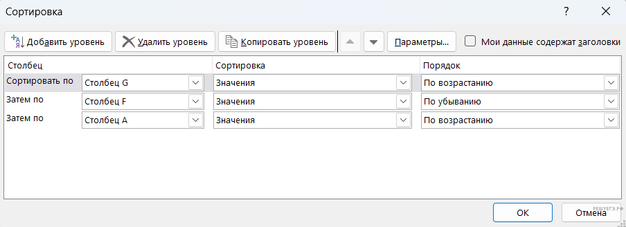 Выберем столбцы от A до G и воспользуемся настраиваемой сортировкой.