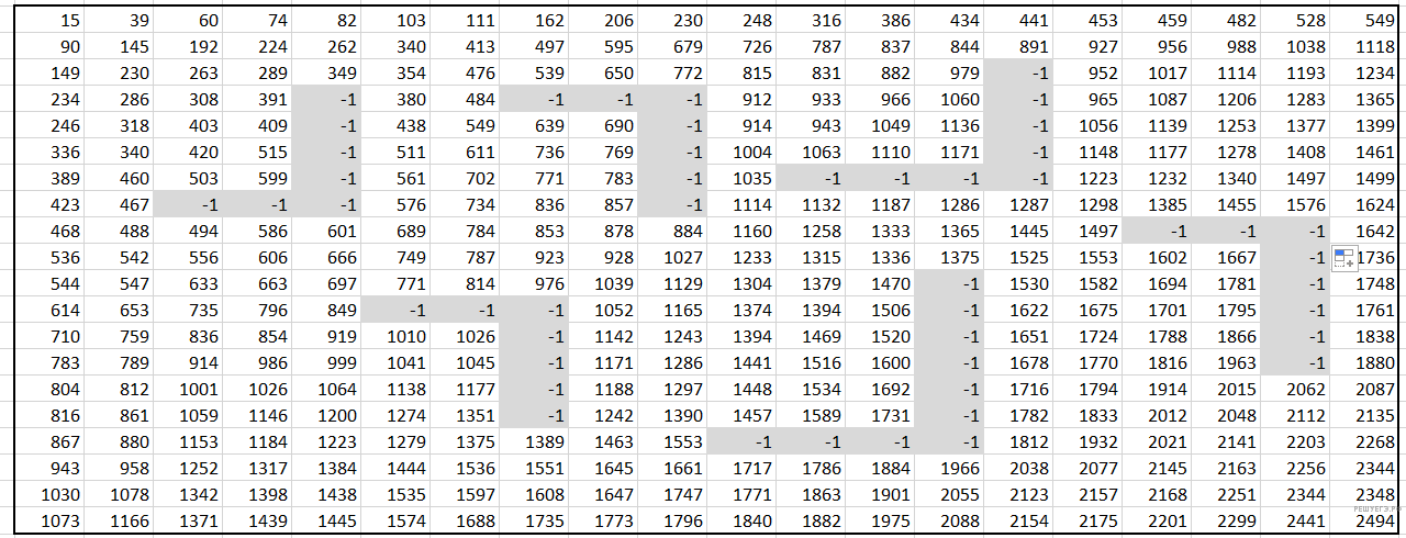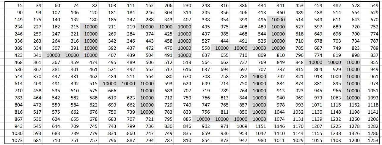 В ячейки отмеченные серым цветом робот заходить не может, в них поставим заведомо большее число, чтобы при выборе минимального значения в ячейке робот не учитывал эти ячейки.
