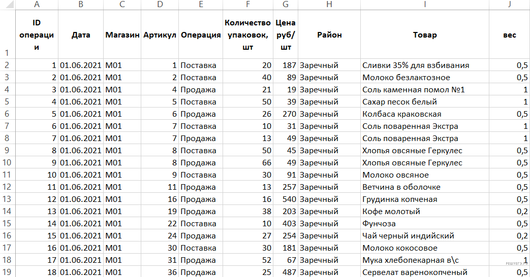 Открыв файл, перейдём на лист «Торговля». Озаглавим столбец H «Район», столбец I — «Товар», а столбец J — «Вес».