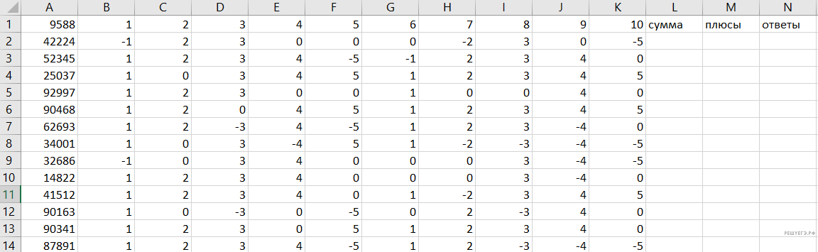 Назовем столбцы номерами задач. Также добавим названия трех столбцов: сумма, плюсы и ответы.
