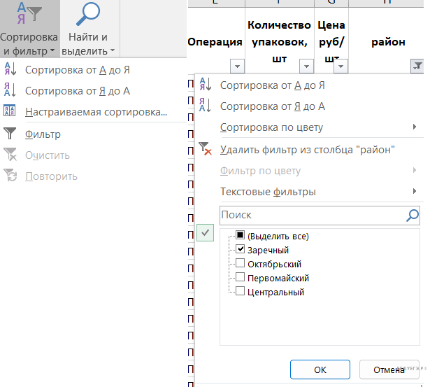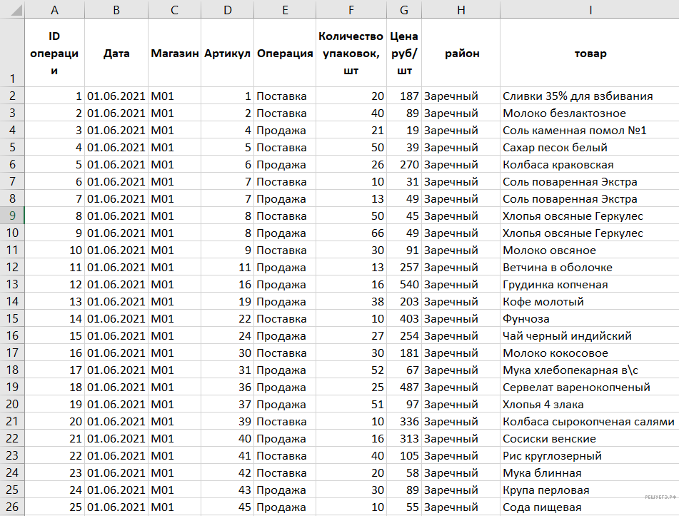 Открыв файл, перейдём на лист «Торговля». Озаглавим столбец H «Район», столбец I — «Товар».