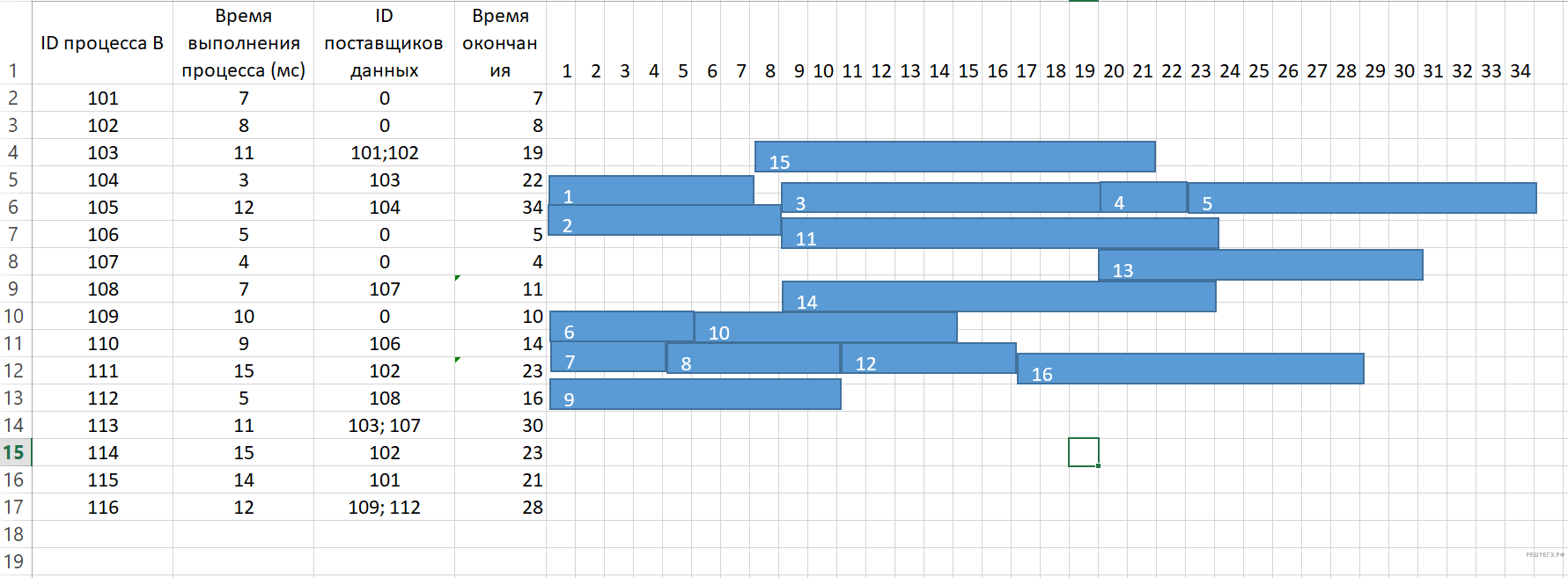 В таблице представлены идентификатор (ID) каждого процесса, его длительность в мс и ID поставщиков данных для зависимых процессов. Для независимых процессов в качестве ID поставщика данных указан 0.