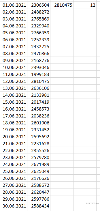 Воспользовавшись формулой =МАКС(O2:O31)), определим максимальную выручку. Максимальная выручка в день в магазинах Первомайского района от продажи товаров отдела «Бакалея» была 12.06.2021, что соответствует числу 12.