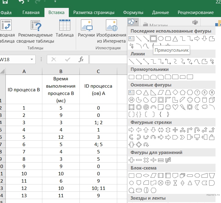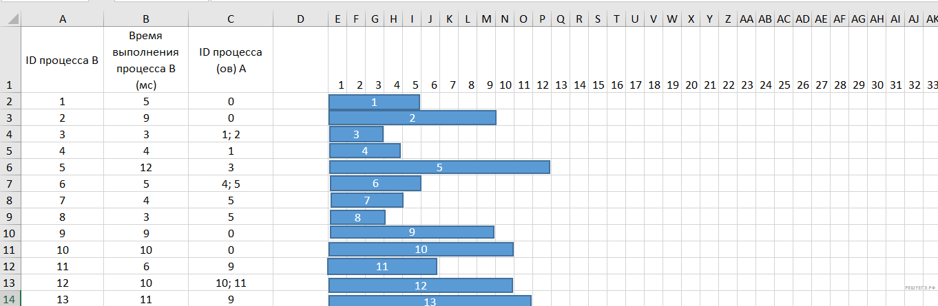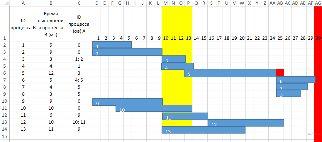 | ID процесса B | Врем выполнения процесса B (в мс) | ID процесса(ов) А |