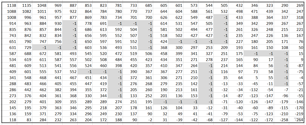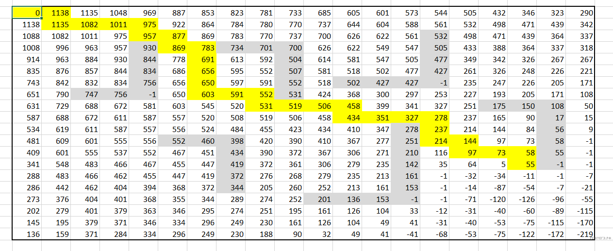 Пойдем от ячейки B44, выделяя цветом слева или снизу наибольшее значение. Получим таблицу: