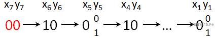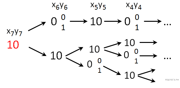 Из последнего уравнения находим, что возможны варианты значений x7 и y7: 10, 01, 00 . Построим древо вариантов для каждого из вариантов значений x7 и y7. Для пары значений 00:
