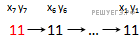 Из последнего уравнения находим, что возможны варианты значений x7 и y7: 11, 01, 10 . Построим древо вариантов для каждого из вариантов значений x7 и y7. Для пары значений 11: