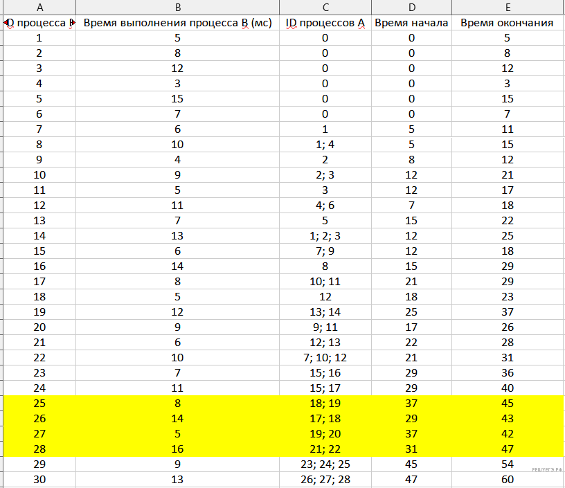 В файле содержится информация о совокупности N вычислительных процессов, которые могут выполняться параллельно или последовательно. Будем говорить, что процесс B зависит от процесса A, если для выполнения процесса B необходимы результаты выполнения процесса A. В этом случае процессы могут выполняться только последовательно. Информация о процессах представлена в файле в виде таблицы. В первом столбце таблицы указан идентификатор процесса (ID), во втором столбце таблицы — время его выполнения в миллисекундах, в третьем столбце перечислены с