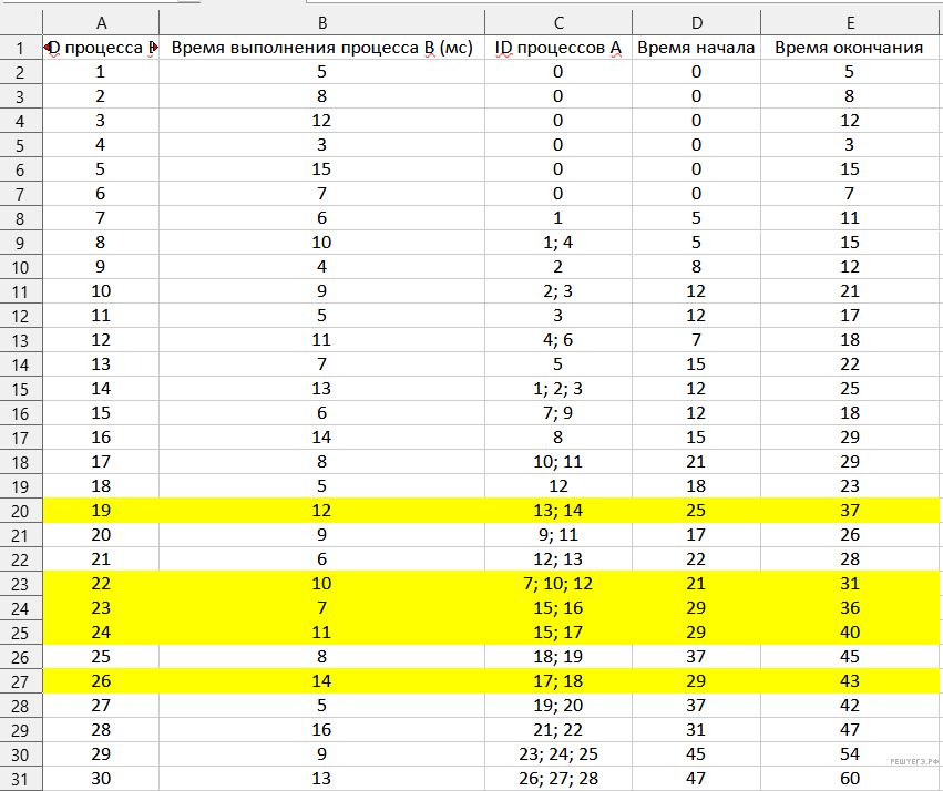 В файле содержится информация о совокупности N вычислительных процессов, которые могут выполняться параллельно или последовательно. Будем говорить, что процесс B зависит от процесса A, если для выполнения процесса B необходимы результаты выполнения процесса A. В этом случае процессы могут выполняться только последовательно. Информация о процессах представлена в файле в виде таблицы. В первом столбце таблицы указан идентификатор процесса (ID), во втором столбце таблицы — время его выполнения в миллисекундах, в третьем столбце перечислены с